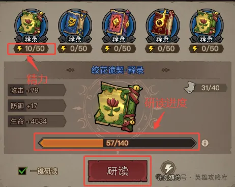 获取古籍后,消耗精力进行研读,每本古籍的精力单独计算,在图中所示小闪电位置处查看。约每10分钟获取1点精力,每消耗1点精力可获得1点研读进度条,每次研读都有一定概率获得基础属性提升(攻击、防御、生命)