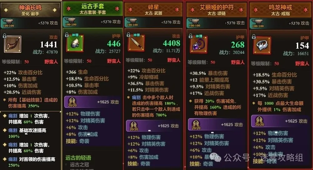 远古四件套(头盔+护腿+鞋+手套,加基础技能伤害),流派武器碎星(加单体伤害),神铸技能奇袭,圣化副手神谕长鸣(核心,加基础技能伤害)!注意该大佬的圣化副手已经5痛割了!都是欧皇,就我一个非酋!