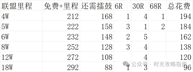 根据联盟实际里程选择对应档位的氪金方案。例如: