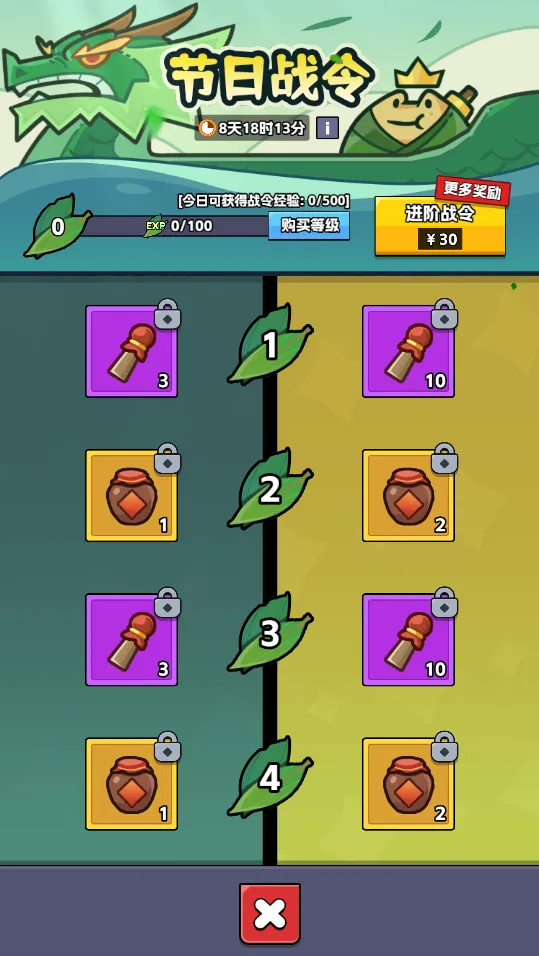 活动期间参与竞技模式或合作模式战斗均可掉落节日战令经验值,每积累100个经验值即可提升战令等级解锁对应奖励。