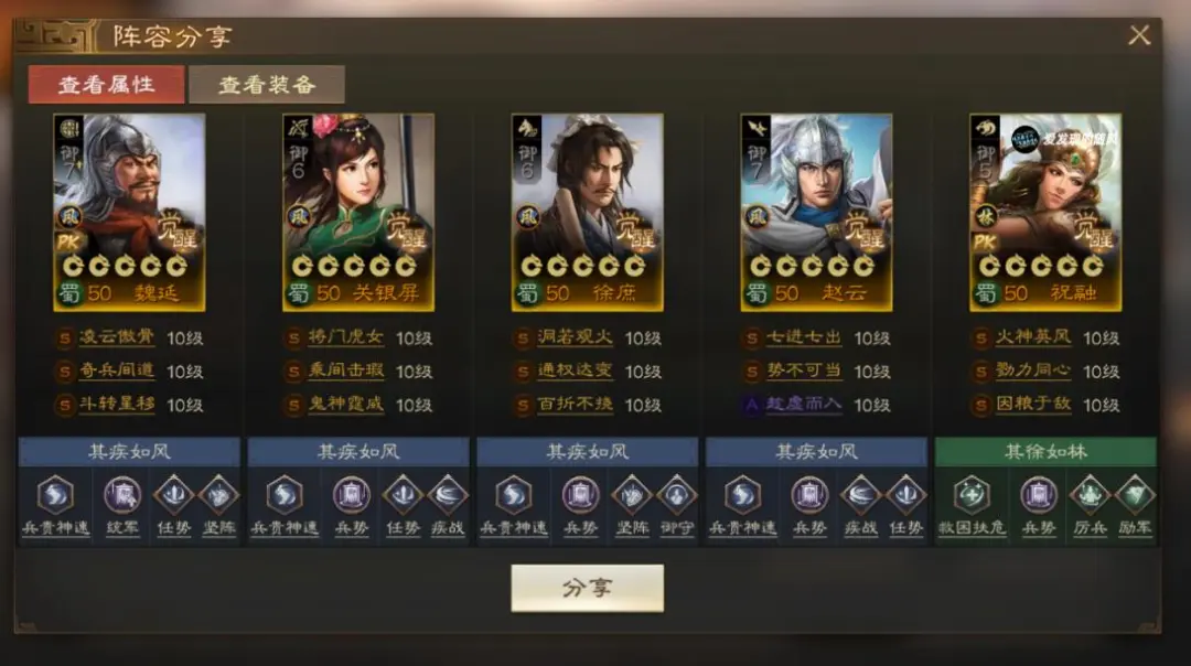 第五人除了庞统之外,用赵云的也不少,带势不可当+趁虚而入,当单点输出,也可以将趁虚而入换成瞒天过海/斩将夺旗。这里展示了祝融的另一种比较新的带法,带戮力同心,给魏延或者关银屏绑,存活能力更强。
