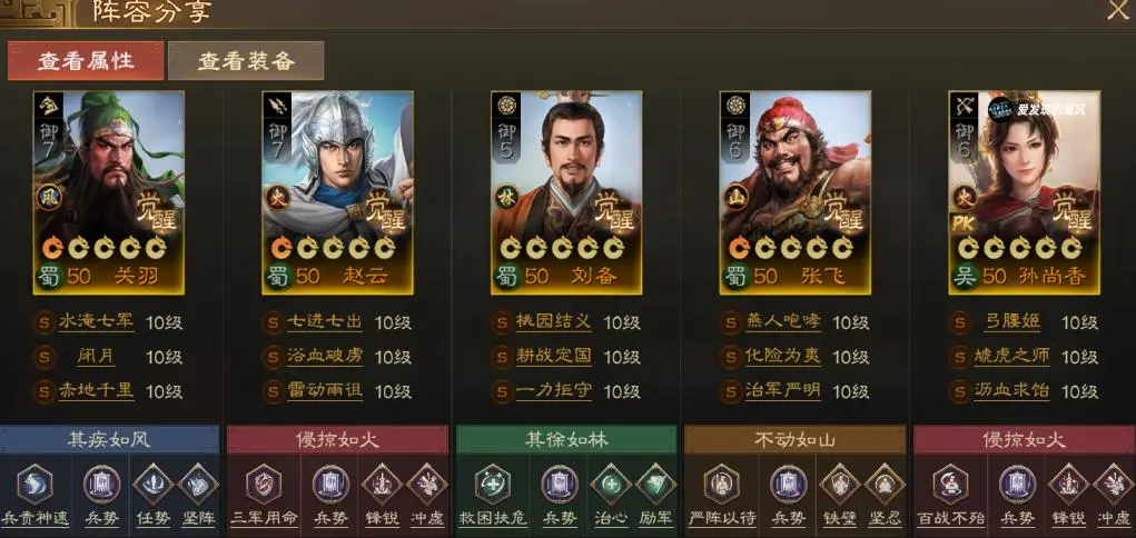这个阵容能同时激活【五虎上将】【桃园结义】【吴姬望蜀】三个羁绊,战法相对来说给得比较低配。