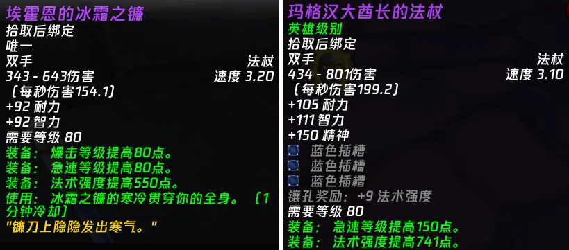 下图则是232的【埃霍恩的冰霜之镰】和264的10人HICC小萨掉落的法杖【玛格汉大酋长的法杖】的属性对比。