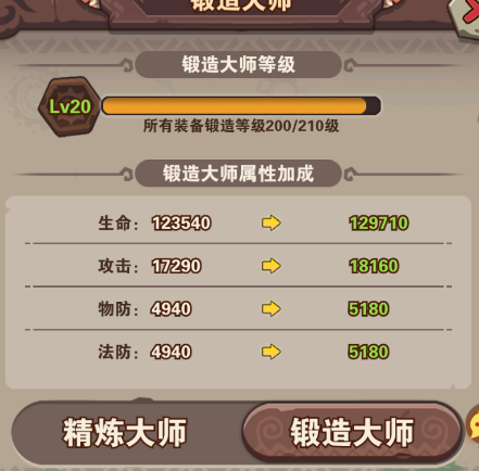 ⑷锻造:需要铁矿来强化装备,也可跟精炼矿一样在历练(过关战将)获得,也可在52级的天命商店购买,氪老可以在福利礼包购买;锻造大师是所有强化装备的总等级,达到也能提升属性。