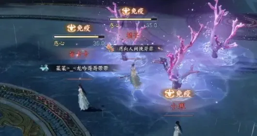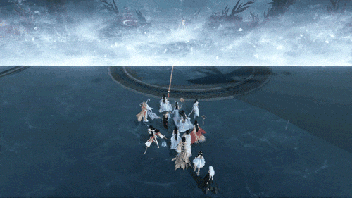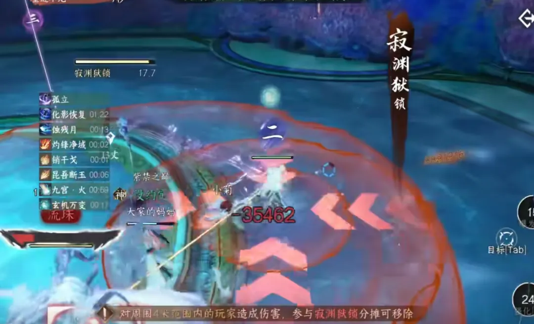 4、排浪阶段,所有人提前回在中间方便排浪,被点名玩家按照箭头方向跑到场地边缘开解控排浪即可,实在躲不过去的可以用流月无痕等无敌技能躲避。